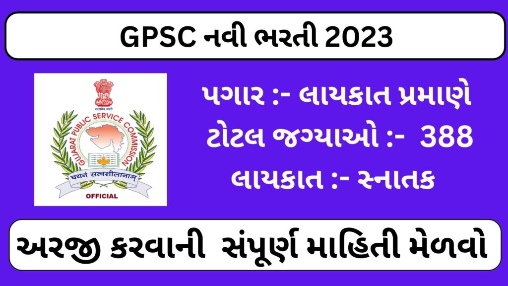 🎆તો મિત્રો અહી આજે આપણે વાત કરીશું ગુજરાત સર્વિસ કમિશન (GPSC) દ્વારા અહી કુલ 388 જગ્યાઓ પર ભરતી કરવામાં આવી રહી છે. અહી ડીવાયએસપી, મદદનીસ જિલ્લા રજીસ્ટર વર્ગ માટે ભરતીની જાહેરાત કરવામાં આવી છે. GPSC દ્વારા કુલ 388 જગ્યા માટે ભરતીની જાહેરાત કરવામાં આવી રહી છે. મિત્રો જેમાં 24 જગ્યા ડીવાયએસપી ની અને અમુક અલગ અલગ GPSC Bharti 2023 માં ભરતી કરવામાં આવી રહી છે.