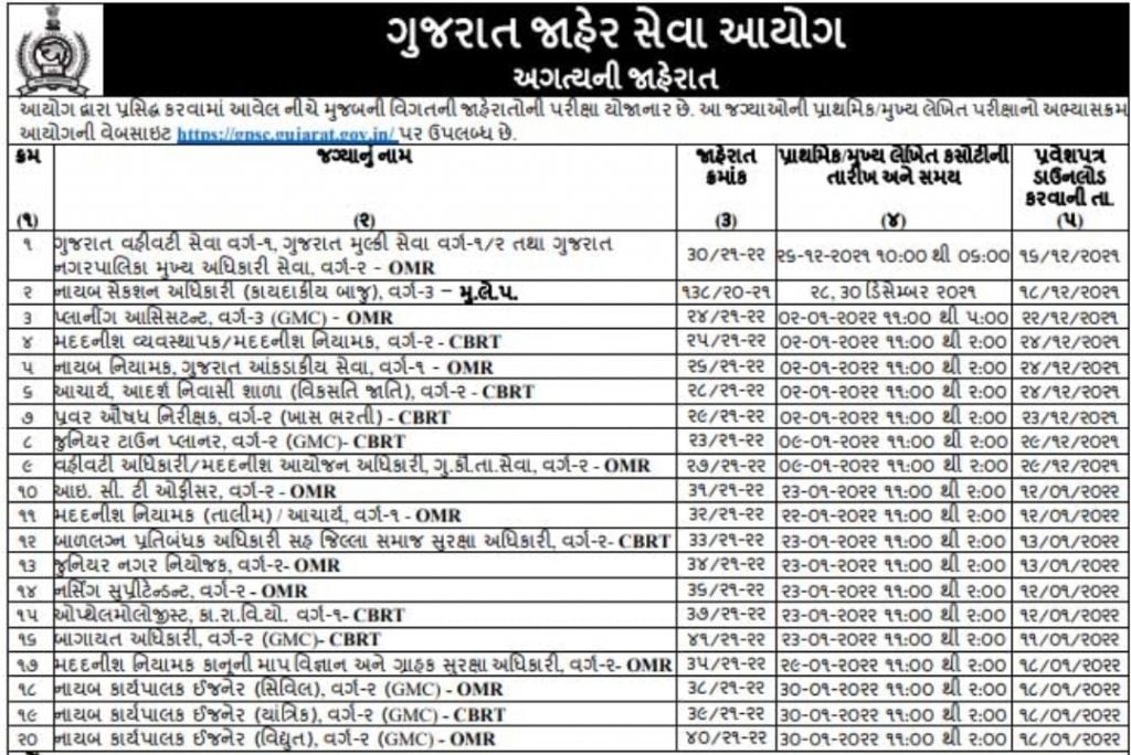 • Gujarat Administrative Service, Class-1, Gujarat Civil Services, Class-1 & Class-2 & Gujarat Municipal Chief Officer Service, Class-2 (Advt. No. 30/2021-22): 26-12-2021