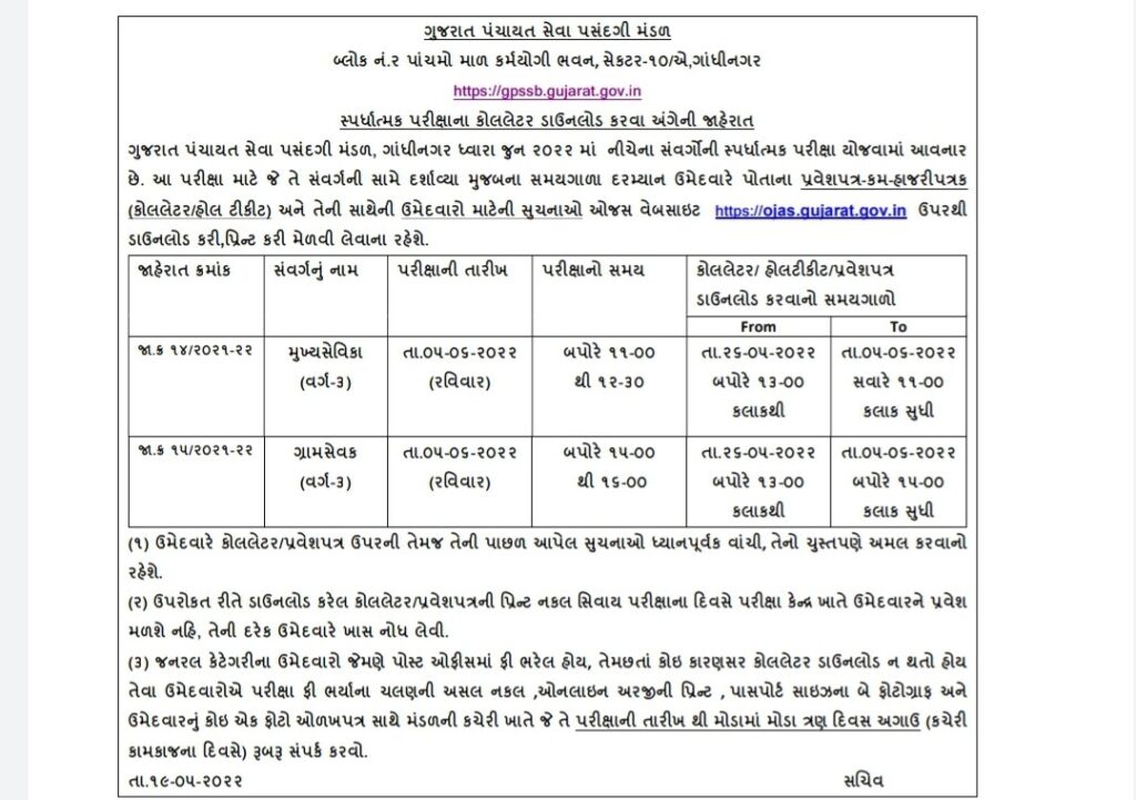 GPSSB Gram Sevak and Mukhya Sevika Call Letter 2022