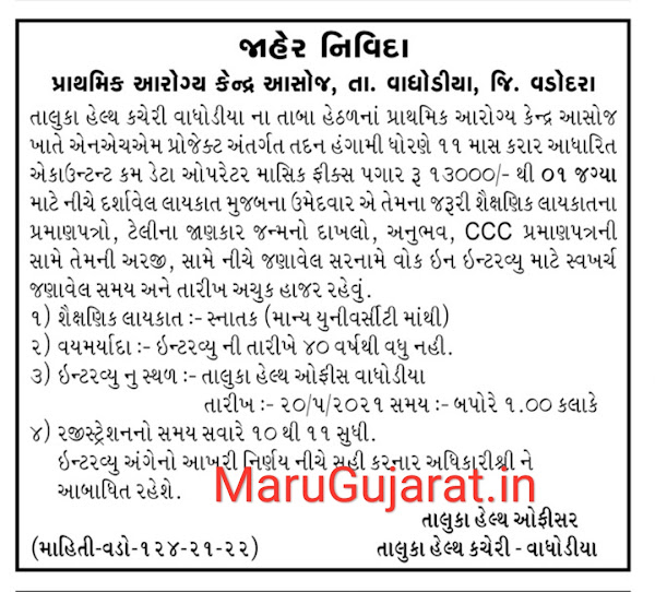 Taluka Health Office, Vaghodiya- 20-05-2021 | Accountant cum Data Operator | Click Here |