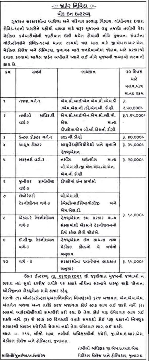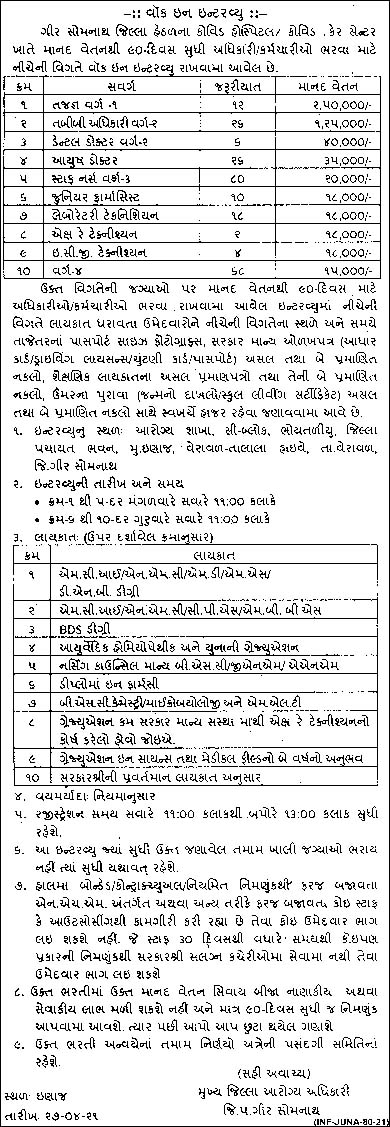 COVID Hospital/ COVID Care Center, Gir Somnath- Until The Requirement Is Filled | Specialist Medical Officer Dental Doctors Ayush Doctor Staff Nurse Jr. Pharmacist Lab. Technician X-Ray Technician ECG Technician Class-4 | Click Here |