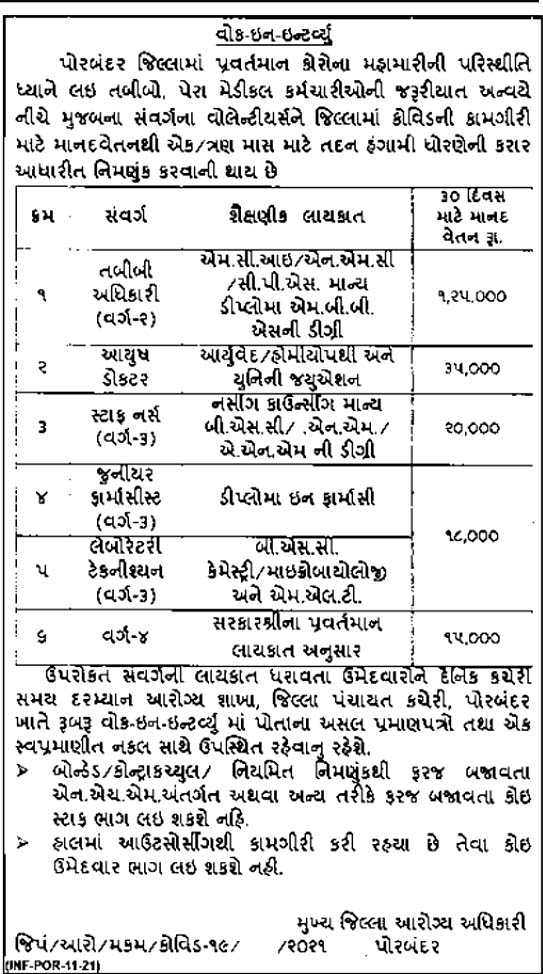 Health Department, Porbandar- Until The Requirement Is Filled | Medical Officer Ayush Doctor Staff Nurse Jr. Pharmacist Lab. Technician Class-4 | Click Here |