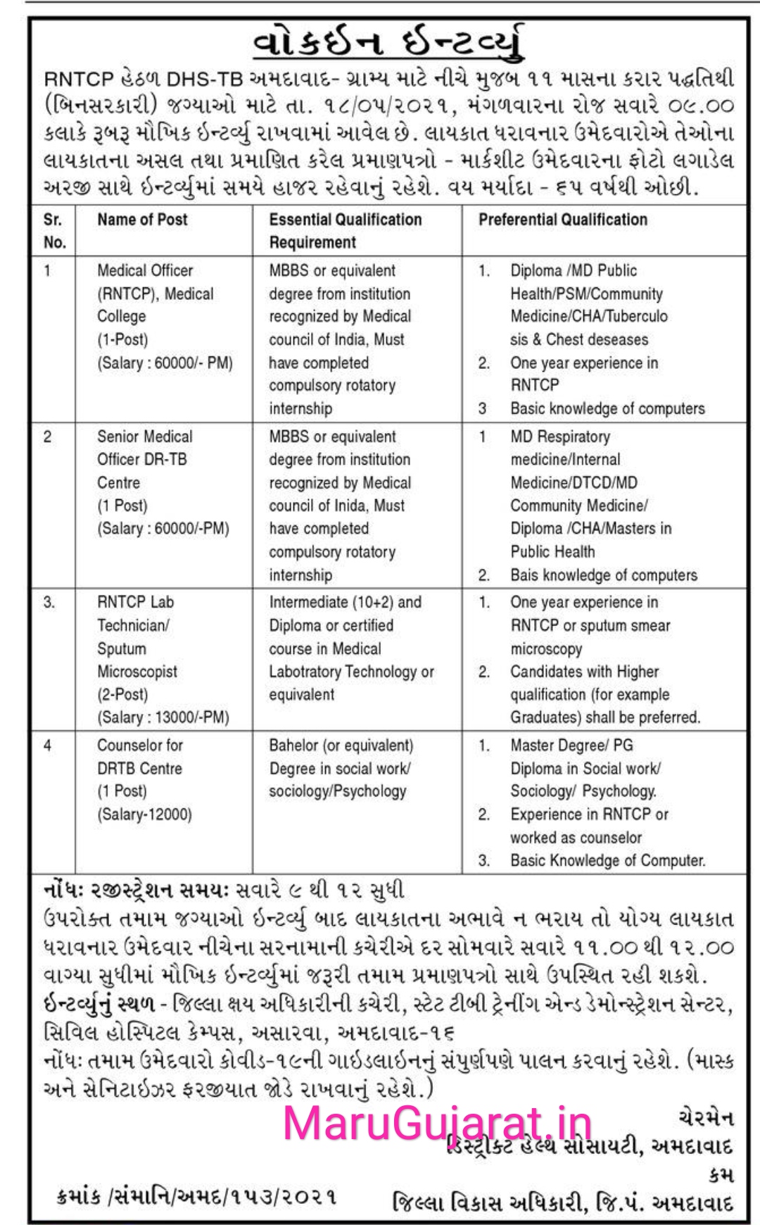District Health Society, Ahmedabad- 18-05-2021 | Medical Officer Sr. Medical Officer RNTCP Lab. Technician Counsellor for DRTB Center | Click Here |