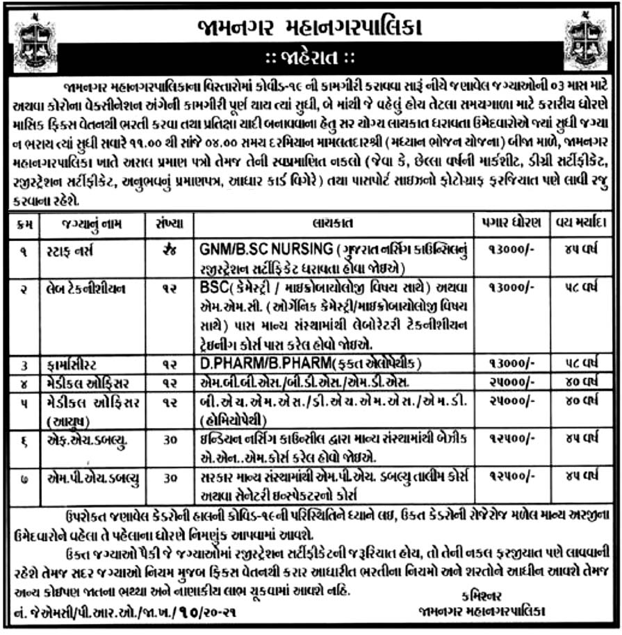 Jamnagar Municipal Corporation- Until The Requirement Is Filled | Staff Nurse Lab. Technician Pharmacist Medical Officer MO Ayush FHW MPHW | Click Here |